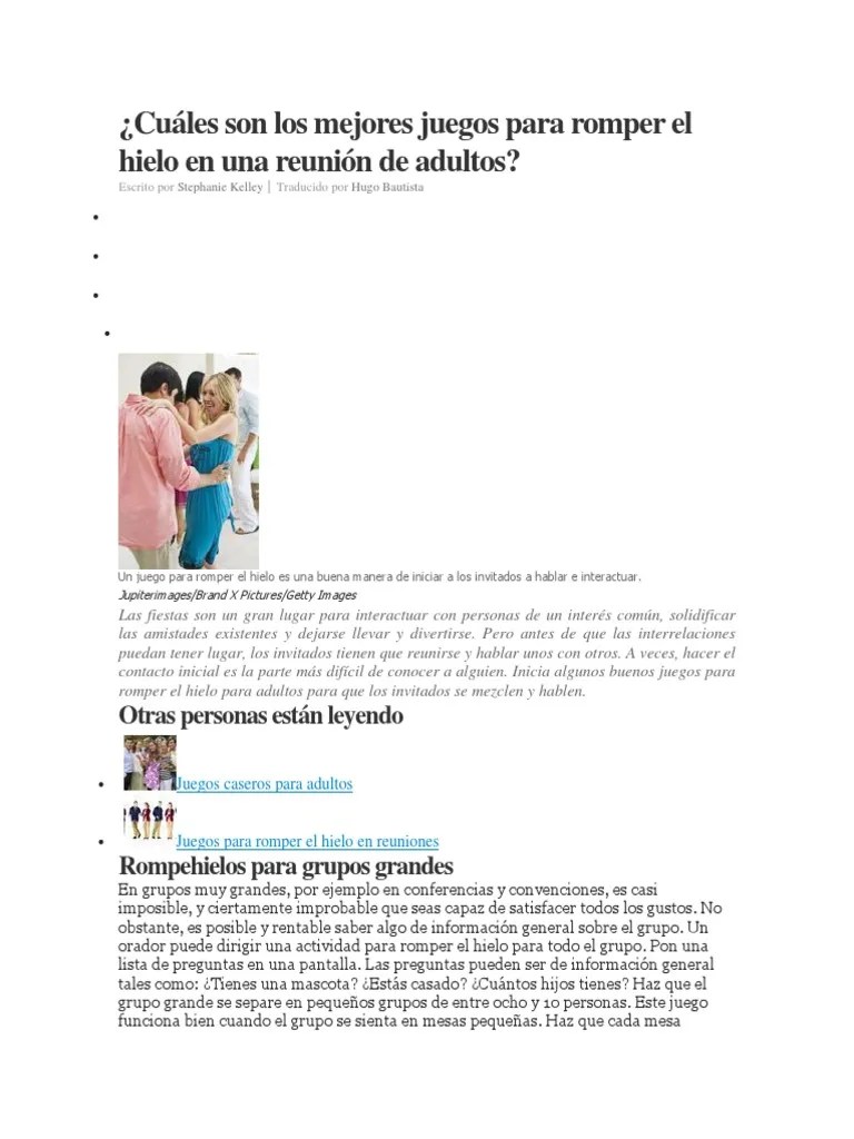 Hemos seleccionado 5 actividades que creemos que pueden ser muy efectivas a la hora . El objetivo de este juego es afianzar y fomentar las relaciones, así como fortalecer la solidaridad entre el equipo por medio de historias e . Los que se deseen y puedan participar, pero debe ser número par. Estos juegos son útiles para ayudar a que todos se conozcan entre . Usa juegos para romper el hielo cuando lleves a gente nueva a tu pequeño grupo cristiano.